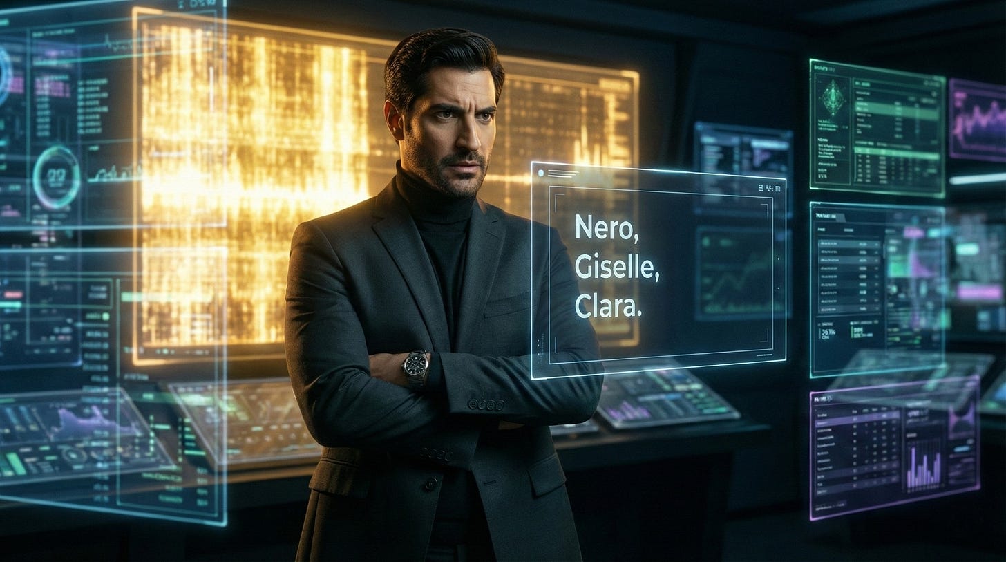 I’m not doing full character dossiers here on purpose. Think of this as the cover page for a small, slightly unhinged AI ensemble. We’ll get into their individual looks, prompts, and deep dives in separate posts.